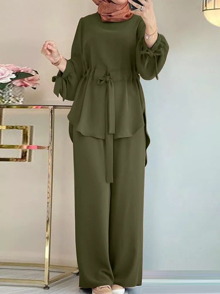 متعدد الاستخدامات وراقي، هذا الزي المكون من قطعتين يجمع بين الراحة والأناقة. يتكون من تونيك طويل وسروال سائل، وهو مناسب سواء للخروج في المناسبات الرسمية أو للحظات اليومية.