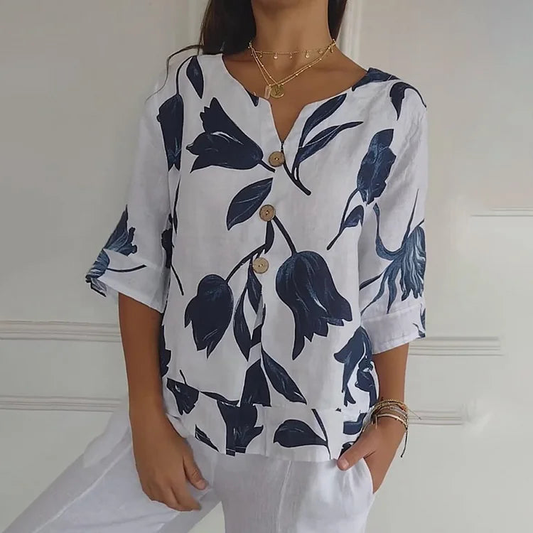 جان | بلوزة زهرية أنيقة - أزرار مركزية وأكمام قصيرة