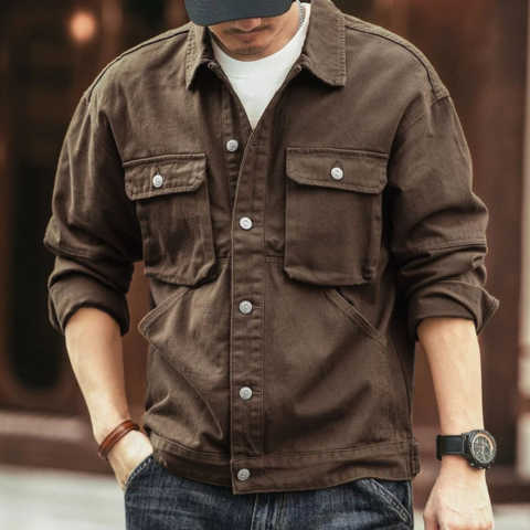Tato pánská bunda s kapsami kombinuje retro kouzlo a moderní eleganci. S pohodlným střihem a precizními detaily nabízí dokonalou rovnováhu mezi uvolněným vzhledem a výrazným stylem. Ideální pro každodenní nošení, přizpůsobí se všem ročním obdobím a příležitostem.