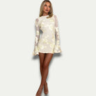 Denne mellemlange kjole forfører med sin delikate blomsterbroderi og let gennemsigtige lange ærmer. Den åbne ryg tilføjer en diskret sensualitet, perfekt til særlige lejligheder. Fås i flere farver, den tilpasser sig alle dine ønsker med elegance.