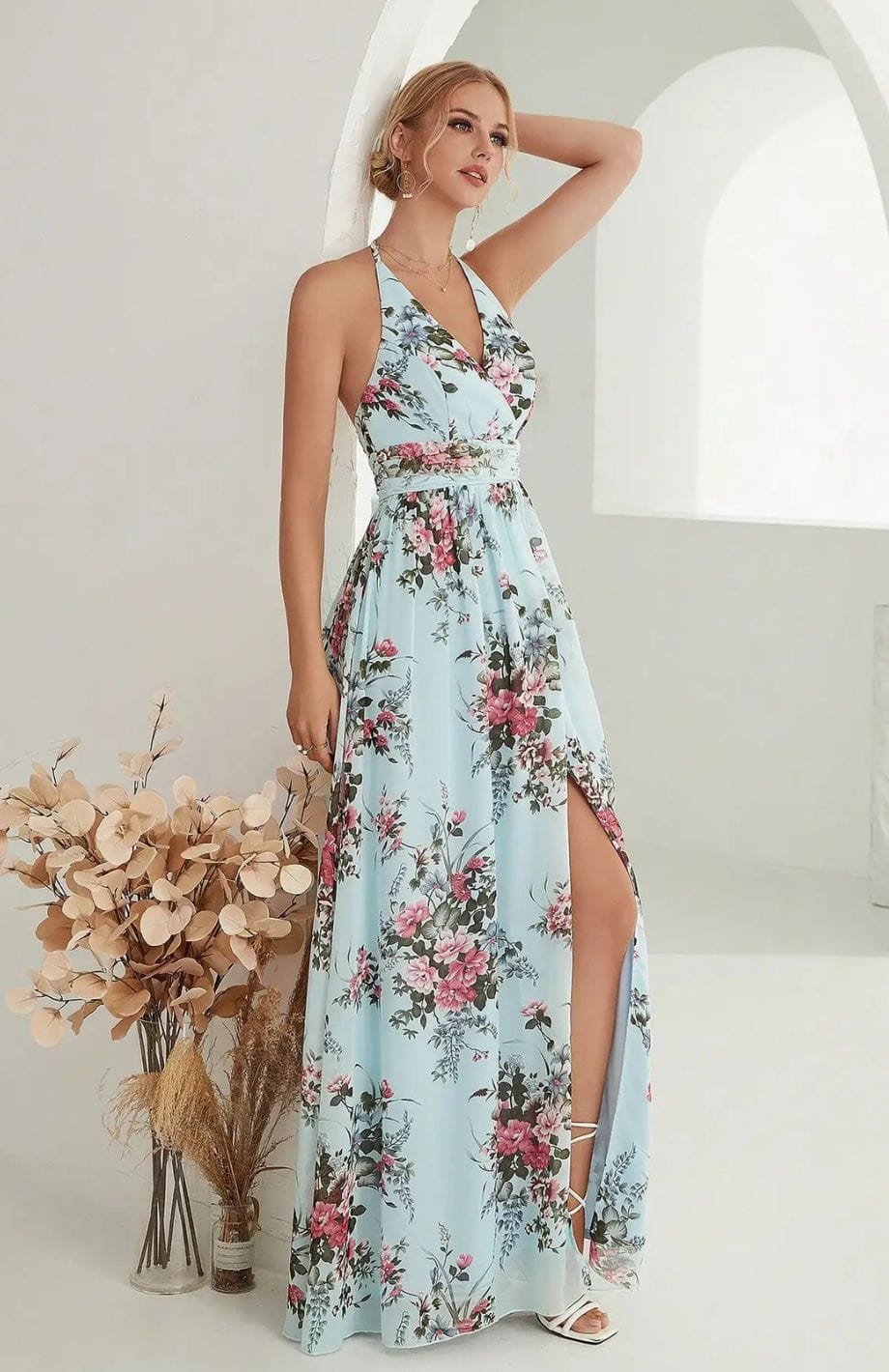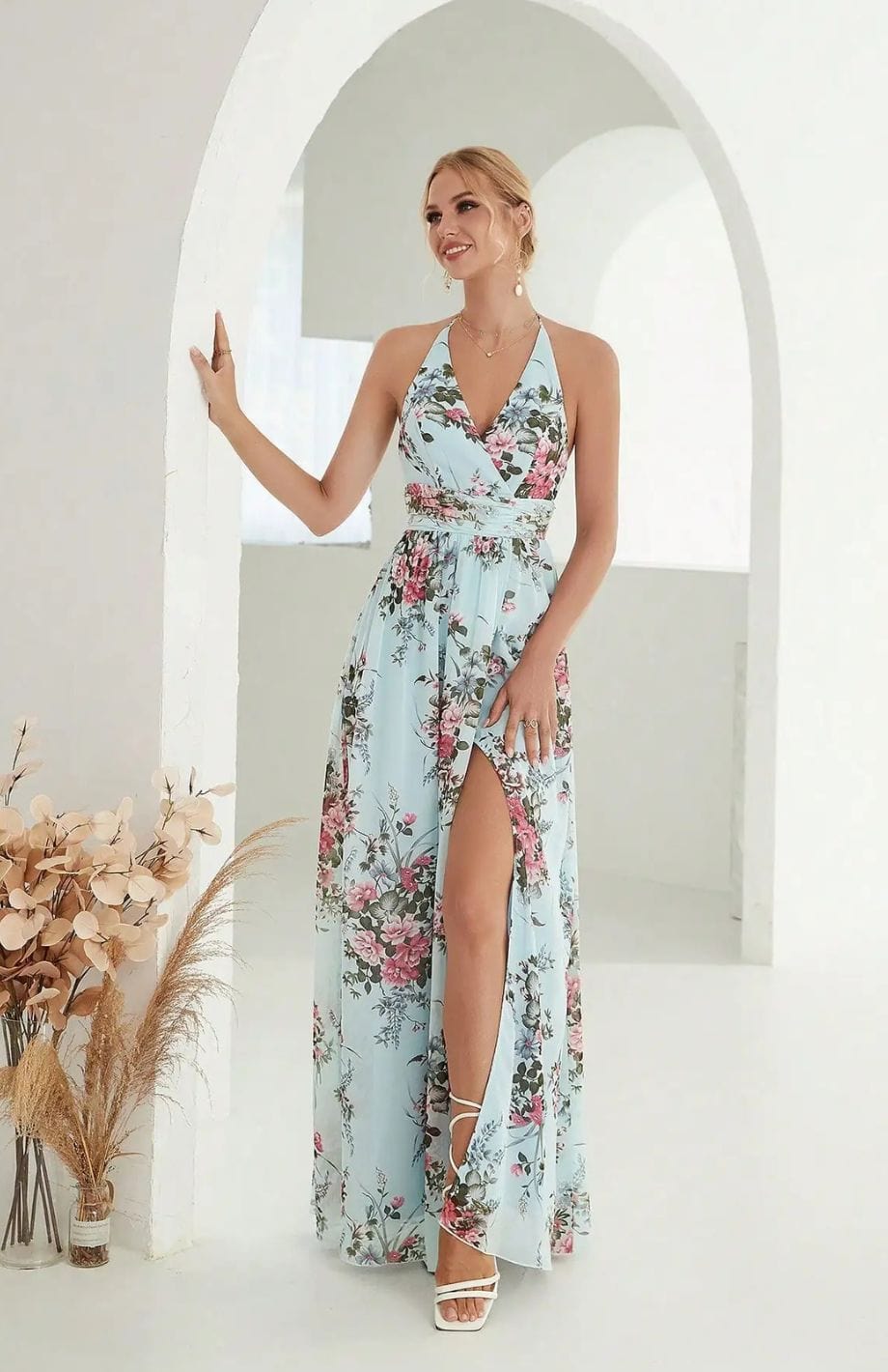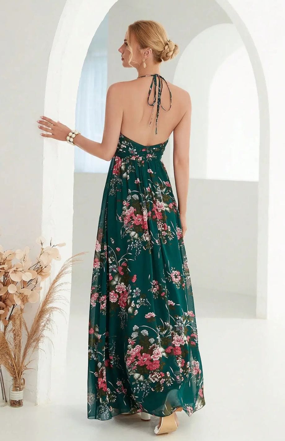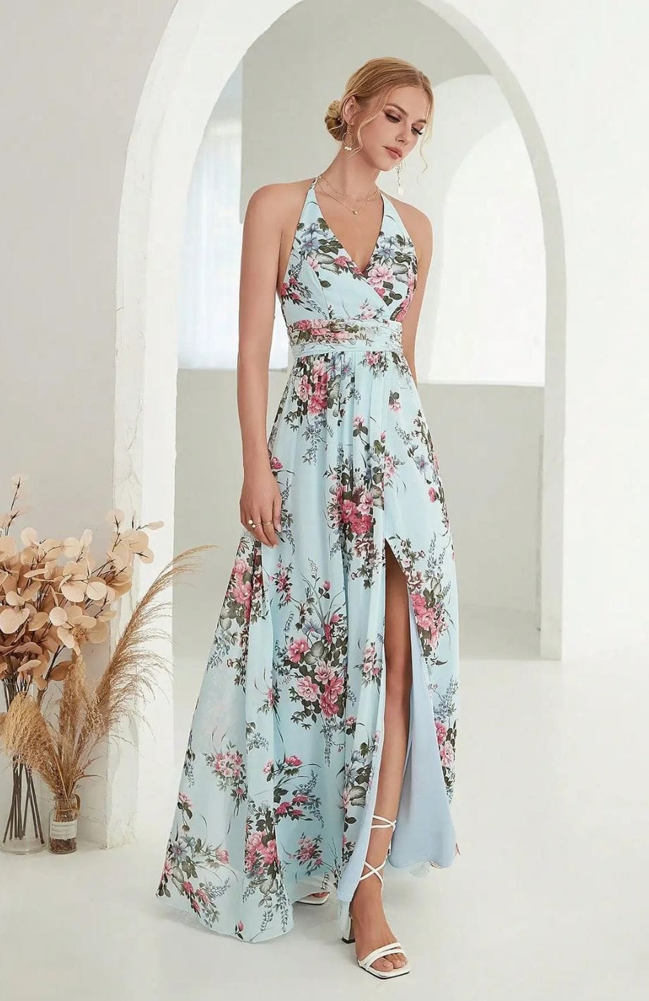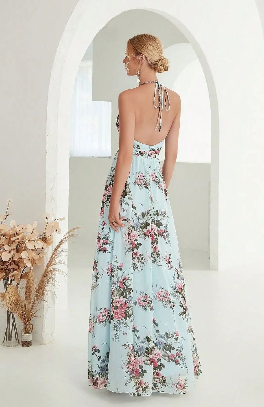 Αυτή η μακριά και ρέουσα φόρεμα είναι ιδανική για γάμους στην ύπαιθρο. Η V λαιμόκοψη και η ζώνη στη μέση αναδεικνύουν τη σιλουέτα. Τα κοντά φουσκωτά μανίκια προσθέτουν μια αίσθηση ελαφρότητας.