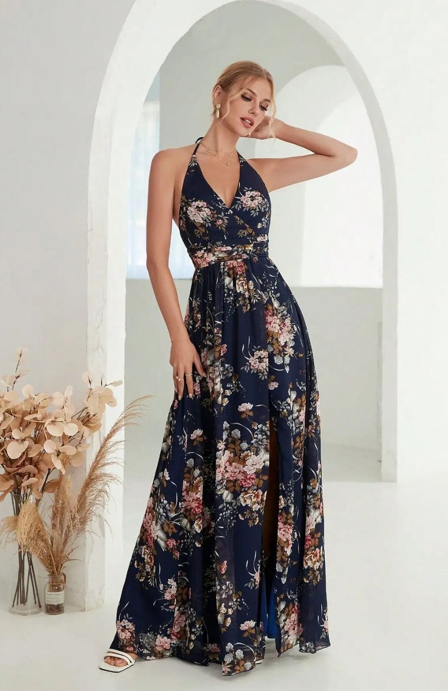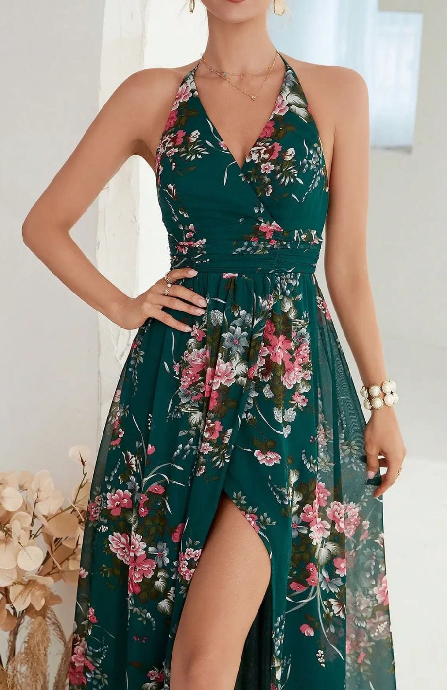 • V λαιμόκοψη και ζώνη στη μέση για να αναδείξει τη σιλουέτα.