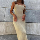 Tämä pitkä mekko korostaa siluettia luonnollisella ja hienostuneella virtaavuudella. Sen minimalistinen muotoilu sopii sekä päivittäiseen asuun että eleganttiin iltatilaisuuteen. Ohut olkaimet ja neliömäinen kaula-aukko antavat sille hillityn ilmeen.