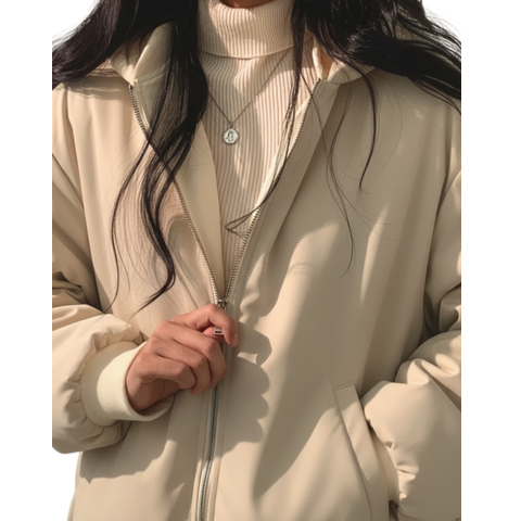Ce blouson se distingue par sa conception réversible, offrant une face gris clair au rendu visuel lisse et une face ivoire à l’aspect plus volumineux. Chaque côté propose une apparence différente : l’un pour un style sobre, l’autre pour une allure plus enveloppante et texturée. Sa coupe courte, sa capuche intégrée et son volume généreux en font une pièce idéale pour les journées fraîches où vous souhaitez varier votre tenue sans changer de vêtement.
