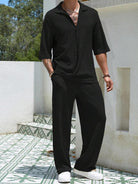 מערך זה כולל חולצה עם שרוולים קצרים עם כיסים ומכנסיים זורמים עם גזרה רחבה. אידיאלי ליציאות מזדמנות או לרגעי רגיעה בבית.