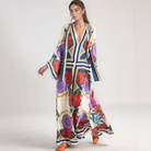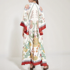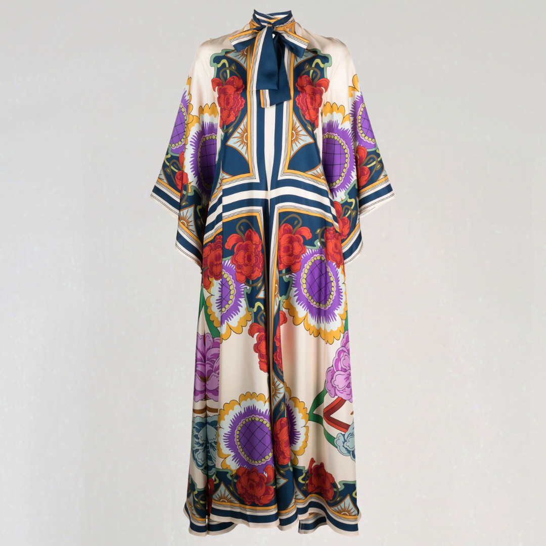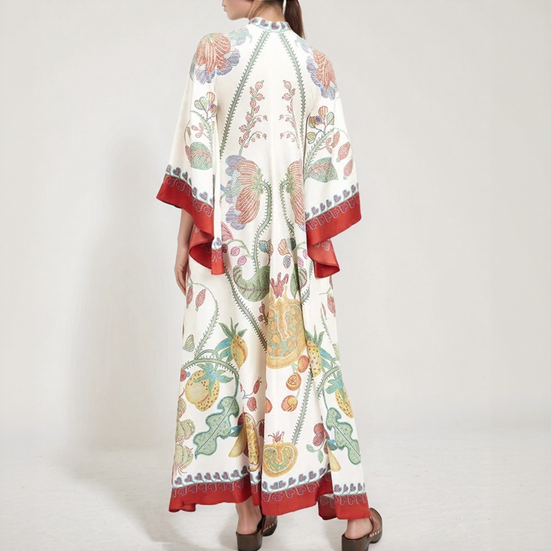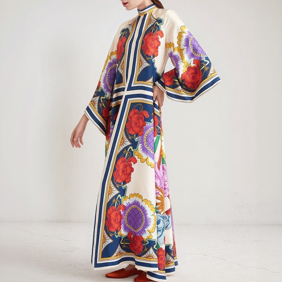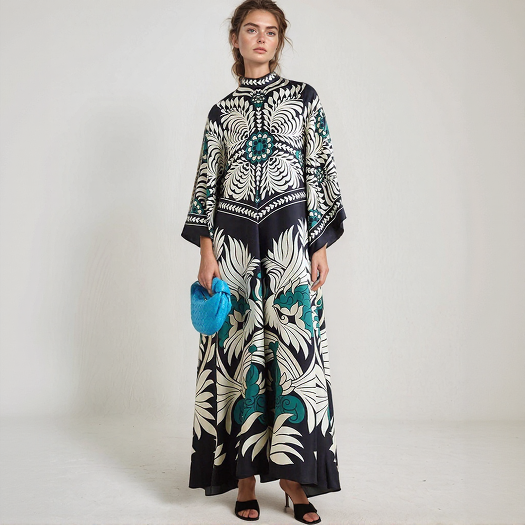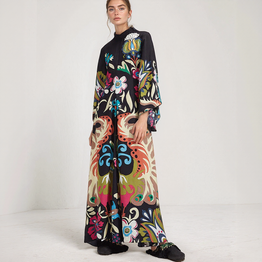 שמלות ארוכות אלה מציגות דוגמאות פרחוניות נועזות וחיתוך זורם. הצווארון הגבוה עם פרטי קשר בגב מוסיף נופך מתוחכם. מושלמת לכל העונות, היא מציעה אלגנטיות בוהמית נצחית.