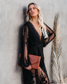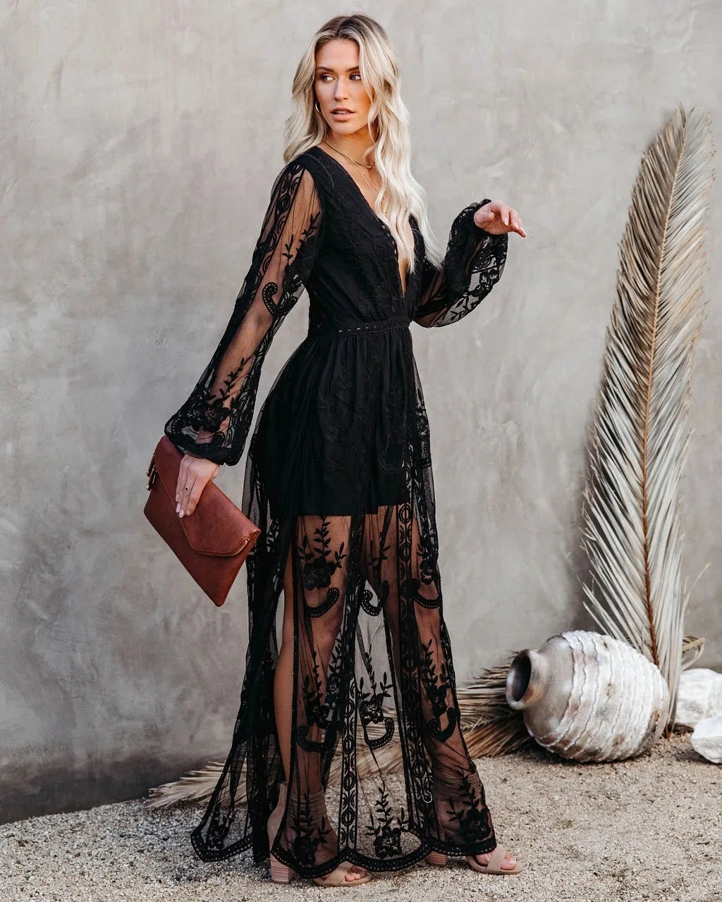 שמלות ארוכה שחורה עם רקמה מפתה בזכות הפרטים העדינים שלה ועם צווארון בצורת V שמדגיש את הלבוש. החיתוך הזורם מאריך את הסילואטה ומדגיש את הנשיות עם מודרניות. מושלמת לימים קיץ כמו גם לערבים אלגנטיים, היא משלבת נוחות עם עדינות בכל מצב.