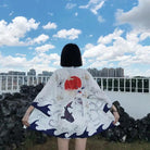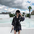 Ez a női kimonó kabát egy finom mintázattal díszített, amely japán madarakat ábrázol, a harmónia és a kecsesség szimbólumait. Bő és légies szabása tökéletes kényelmet biztosít, legyen szó laza vagy elegáns megjelenésről.