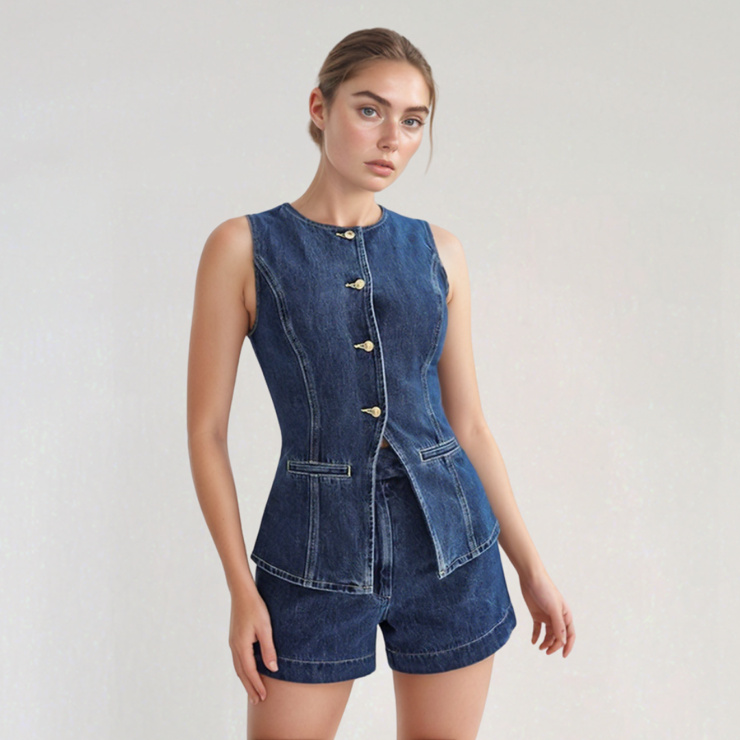 Questo completo include un gilet senza maniche strutturato con bottoni dorati e tasche frontali. I pantaloni corti a vita alta offrono una vestibilità flattering e un comfort ottimale.