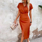 Questo abito midi offre una silhouette lusinghiera con il suo scollo a V e le maniche corte. La sua tonalità calda e la fessura sottile aggiungono un tocco di sofisticatezza.