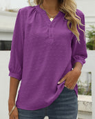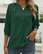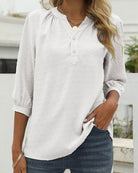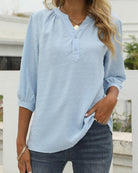 このクラシックなブラウスは、時代を超えたカットと現代的なタッチを組み合わせています。ボタン付きのスリットカラーがスタイルを引き立て、わずかにギャザーの入った袖が女性らしさを添えます。毎日、きちんとした快適なルックに最適です。