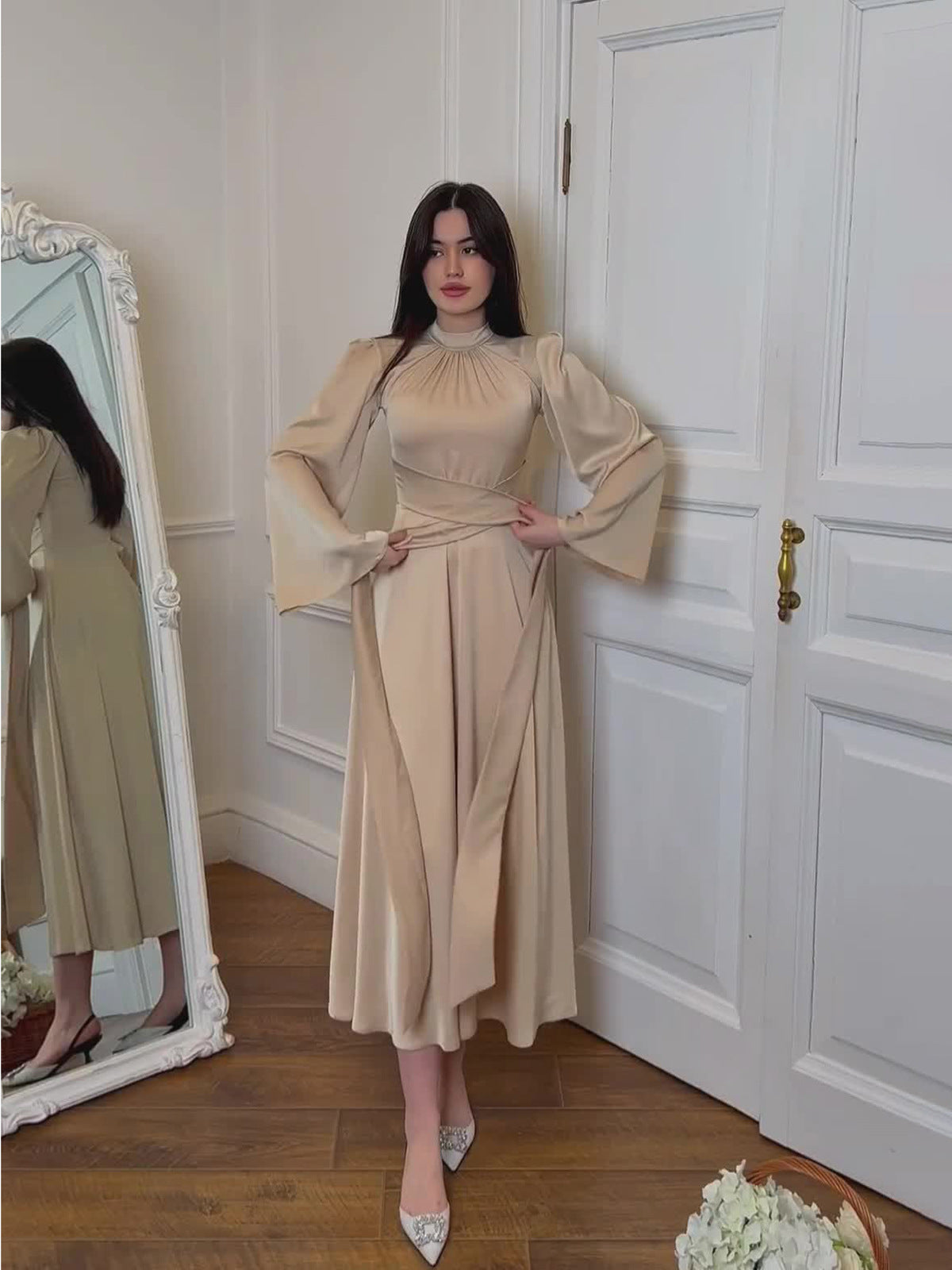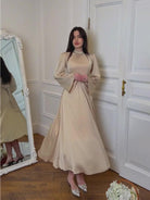 このロングドレスは、高い襟、長い袖、流れるようなシルエットで洗練を体現しています。統合されたベルトは、控えめにウエストを引き立て、構造と女性らしさをもたらします。特別なイベントに最適で、快適さ、スタイル、エレガンスをシンプルに兼ね備えています。