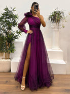 Deze lange jurk heeft een uniek bloemenmotief. Het ontwerp met één schouder en de zijsplit voegen een vleugje elegantie toe.