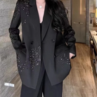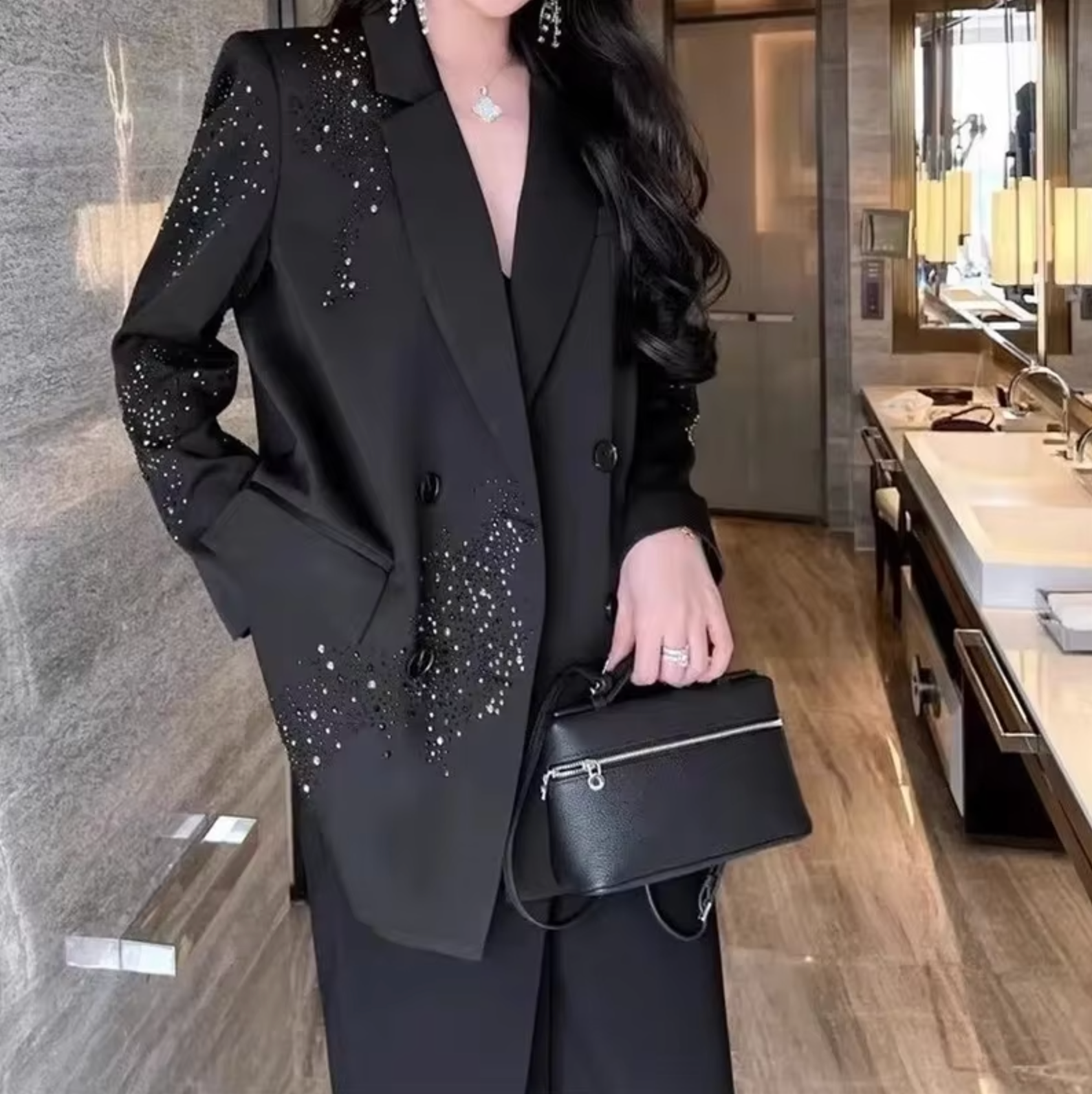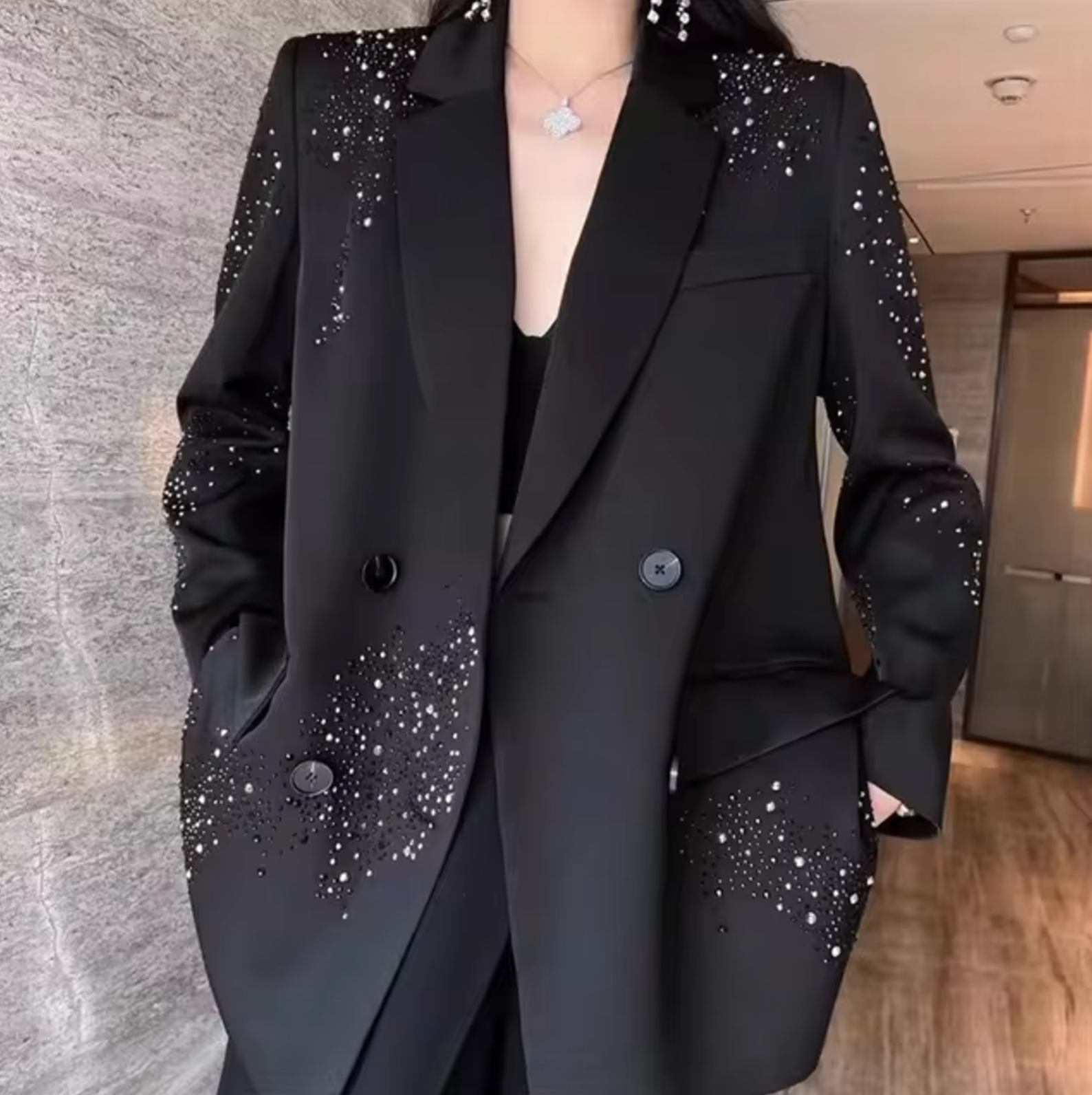 This black jacket embodies modern elegance with a touch of delicate shine. Its sparkling details add a refined note to your look, without ever being over the top. Perfect for a chic evening or a distinguished professional look, it combines sobriety and brilliance.