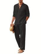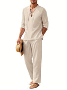 Dyk ner i en avslappnad elegans med denna bohemiska chic outfit bestående av en långärmad topp prydd med snörning vid halsen och ett flödande byxor med lös passform. Perfekt för soliga dagar eller avslappnade utflykter, denna set kombinerar stil och komfort. Dess lätta passform, praktiska fickor och justerbara midja gör det till ett val som är både estetiskt tilltalande och funktionellt.